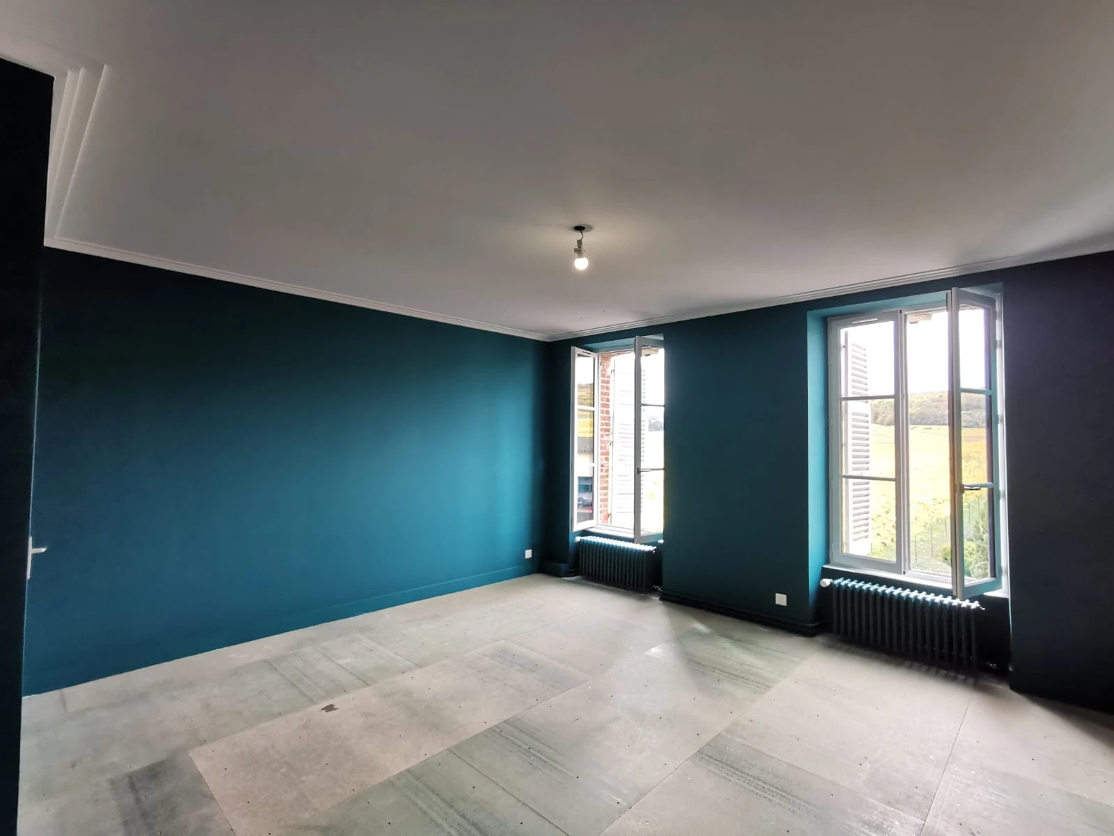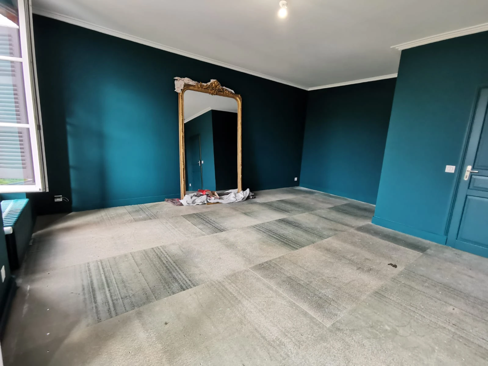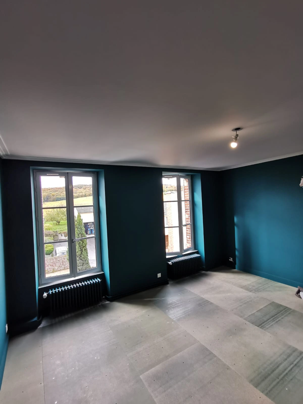 Réalisations: Ponçage / Enduits / Sous-couche/ Laques acrylique sur les boiseries et radiateurs fenêtres / Peintures mat profond teinté type 1900 sur les murs et plafonds..